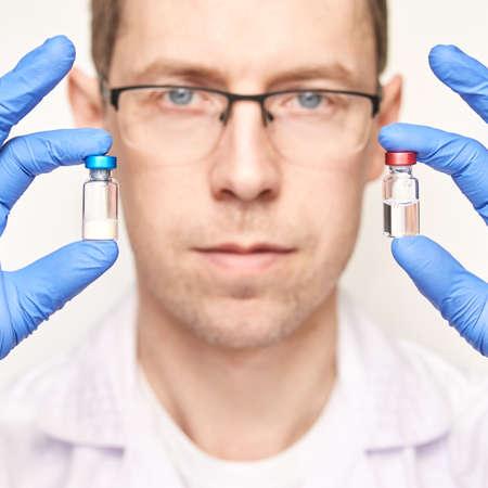 Male person in blue glove hold vaccine bottles. Injection drug pharmacy concept. Medical nurse therapy. People hand health science. Horizontal banner. Man face