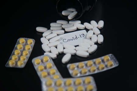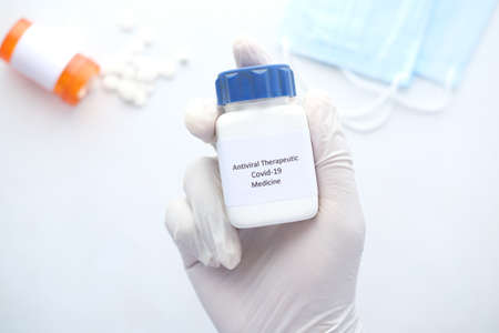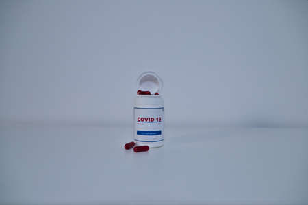 A white bottle of covid-19 antiviral pills in the laboratory. Concept of the new antiretroviral treatment pill Covid-19.