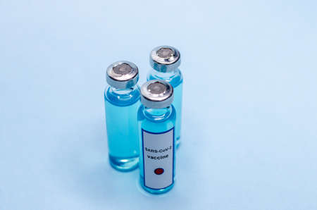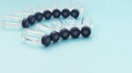 Glass vials with vaccine liquid on a blue background. The concept of medicine, vaccination and injection.