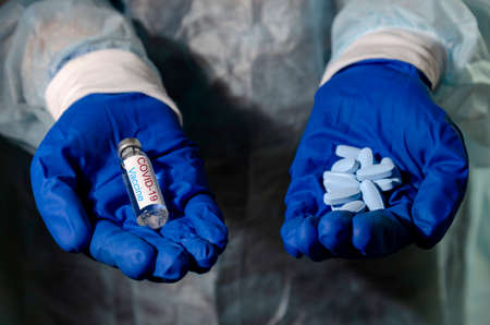Doctor holding pills and ampoule of covid-19 vaccine. Concept of vaccination choice