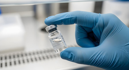 A close-up shot of a scientist's hand in a blue medical glove holding a small glass vial containing a clear liquid. The setting is a sterile laboratory environment, suggesting the development or handling of a vaccine, medicine, or scientific sample. The image represents pharmaceutical research, healthcare, and scientific discovery.