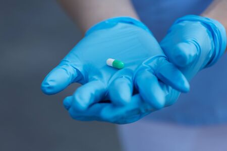Female doctor hand showing capsule or pill for curing disease. Closeup of vitamin. pharmaceutical prescription.
