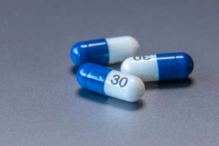 Blue and white tablet pills on a gray background. Healthcare medical.