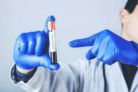 Hand in blue medical gloves holding small ampoule with label Covid-19 vaccine. Coronavirus covid 19 cure concept.