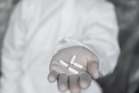 Doctor in white protective suit, medical mask and rubber gloves is holding a white pills as a medications from coronavirus pandemic threat. Epidemic, pandemic of coronavirus covid 19.