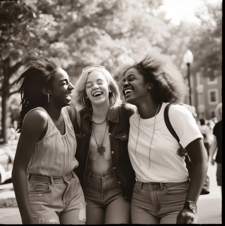 portrait of smiling women in the style of the 80s in the big city