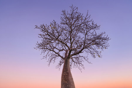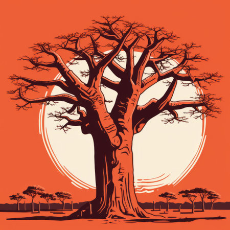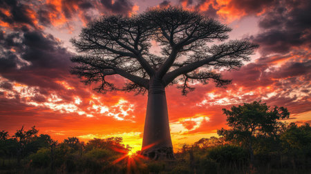 A majestic baobab tree stands tall against a vibrant sunset sky. Its unique. bottle shaped trunk and sprawling branches create a breathtaking silhouette. perfect for adding a touch of exotic beauty to any design project.