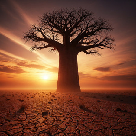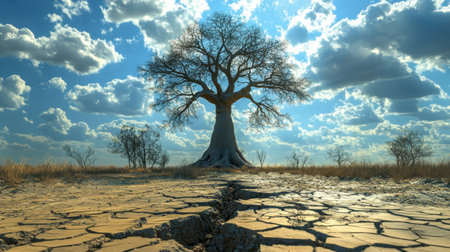 A stunning baobab tree stands tall against a backdrop of dramatic clouds in an arid landscape. The cracked earth highlights the beauty of resilience in nature.