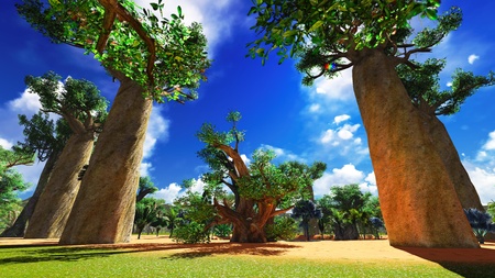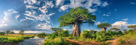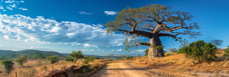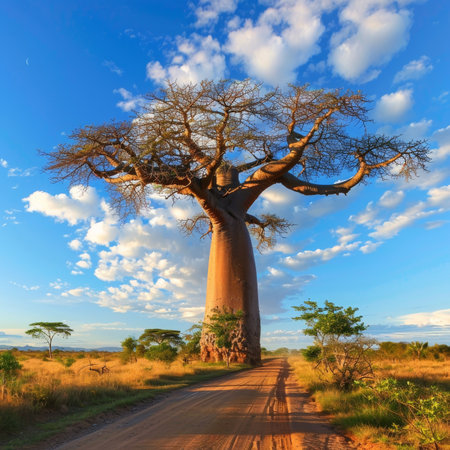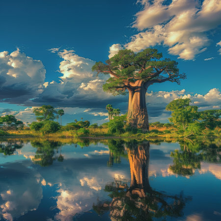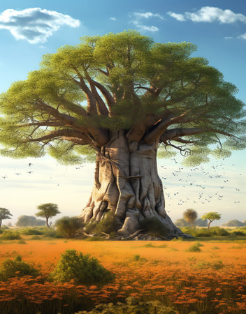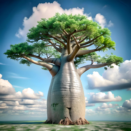 A stunning 3D illustration of a majestic Baobab tree. standing tall against a vibrant blue sky with fluffy clouds. Perfect for nature documentaries. educational materials. or any project requiring a touch of African wilderness.