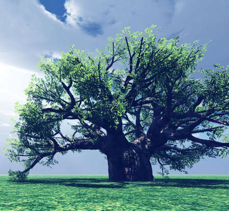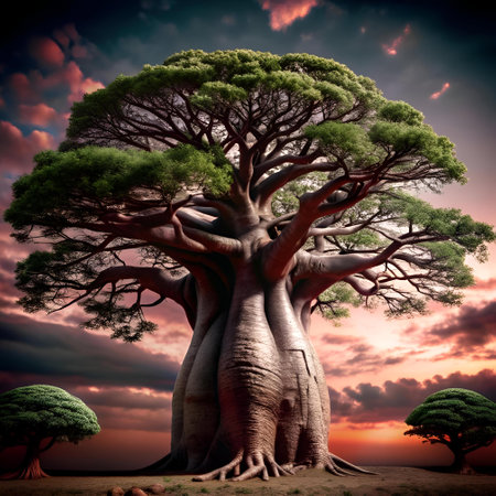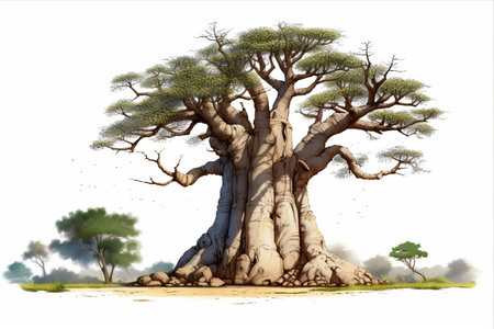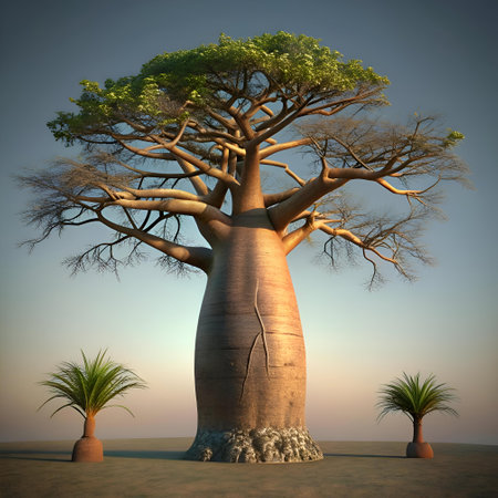 A majestic 3D illustration of a towering Baobab tree. with its distinctive thick trunk and expansive branches reaching towards the sky. Perfect for adding a touch of African wilderness to your designs.