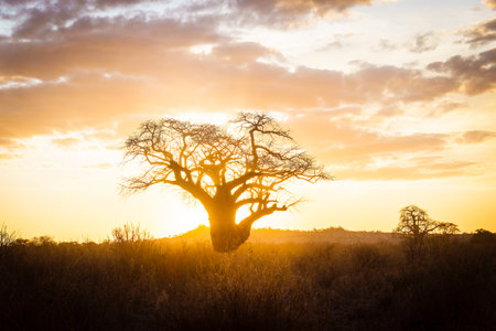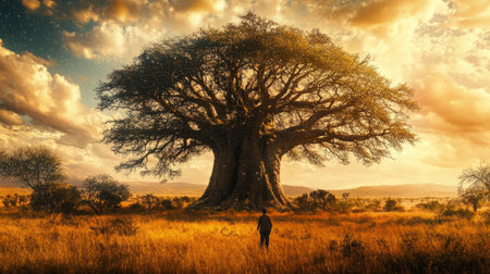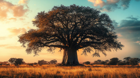 Majestic african baobab tree at sunset in the vast savannah landscape