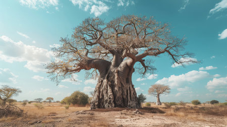 An ancient baobab tree with a massive trunk and sparse leaves creates a unique and striking background with copy space.