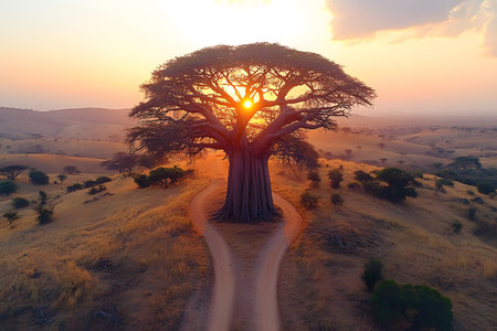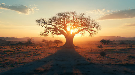 A breathtaking view of a baobab tree standing tall on sunlit savannah terrain during sunset. the warm glow of the sun creates a captivating silhouette, emphasizing the tree's grandeur. surrounding golden grasses and distant hills complete the scene. Generative AI