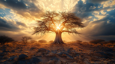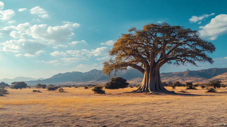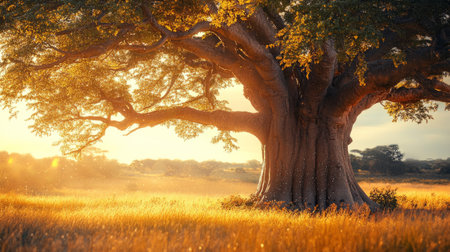 Ancient baobab tree surrounded by a golden savanna, water droplets shimmering on its thick bark after a gentle rain generative ai