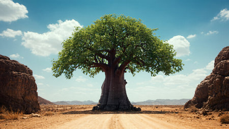 A single giant baobab tree grows amidst the barren landscape. On both sides of the road there are only rocks and cliffs, AI Generated.
