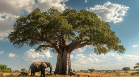 A peaceful elephant standing under a massive baobab tree, enjoying the shade on a hot afternoon.