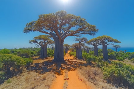 Baobab trees stand prominently under a clear blue sky, their expansive canopies casting intricate shadows on the sunlit, red dirt path. surrounding greenery contrasts with the vivid landscape, offering a serene, natural scene. Generative AI