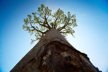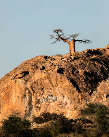Sacred baobab is landmark on rocky cliff above the savannah in Botswana. An unusual baobab growing on mountain against the background of the evening sky.