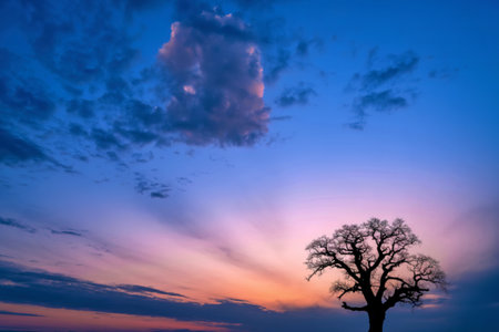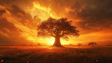 A stunning solitary tree silhouette stands against a vibrant sunset sky, showcasing dramatic clouds and a serene landscape filled with tranquility and beauty.