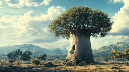 A stunning baobab tree stands gracefully in a vast landscape, surrounded by lush greenery and majestic mountains under a bright sky, symbolizing nature's beauty.