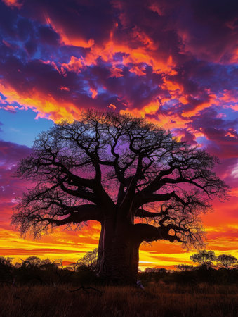 A majestic baobab tree stands in silhouette against a vibrant African sunset sky. Clear details and vibrant co...