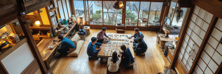 Friends gather around a low table, playing board games in a warm traditional house with large windows letting in natural light.
