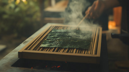 A sheet of seaweed is gently steamed over a small, hot grill. The process creates light smoke.