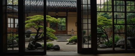 AI Generated. Vew of Japanese traditional garden through an old house's windows at Matsue city in Shimane, Japan