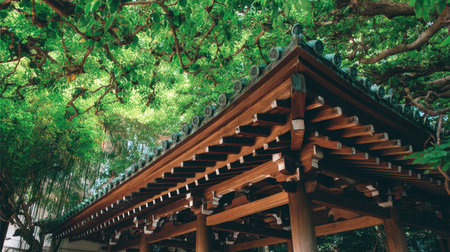 A stunning view of traditional Asian architecture featuring a wooden roof framed by lush greenery, creating a tranquil outdoor atmosphere perfect for relaxation.