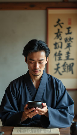 A serene young Asian man dressed in a dark kimono sits quietly, cradling a tea bowl in his hands, immersed in thought. The backdrop features elegant calligraphy, enhancing the tranquil atmosphere of this moment of mindfulness and cultural appreciation.