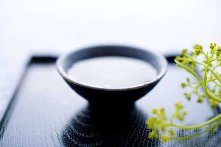 Japanese matcha green tea drinking in bowl on black wooden tray on table. Hoot and herbal drinking. Food and drink culture or traditional of Japan.