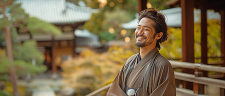 A joyful, content man dressed in a kimono strolls and leans on a fence in an outdoor Japanese garden while admiring the surrounding scenery.
