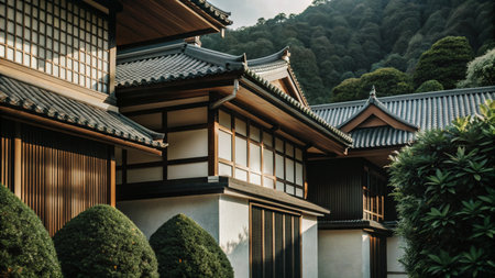 Traditional Japanese architecture with wooden beams, white walls, and tiled roofs, set against a backdrop of lush greenery.