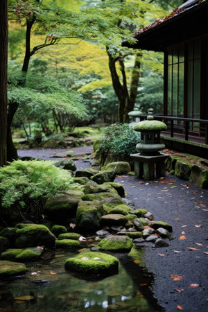 Tranquil Japanese Zen garden with meticulously raked gravel, lush greenery, and stone elements, representing peace and harmony. Generative AI