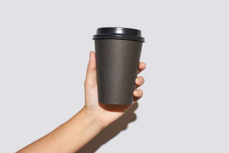 Girl hold coffee paper cup. Grey background with copy space. Female arm holding paper glass. To go, away. No ecology. Hard shadows. Horizontal banner