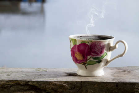 White floral hot coffee cups on a wooden table and a shining river view background with copy space.