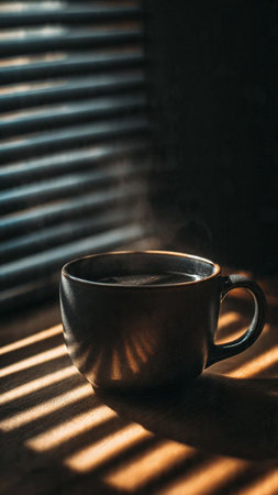 Black coffee cup on table with shadow from blinds. Black and white photo.
