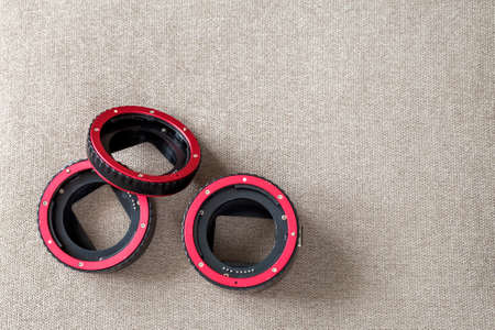 Close-up of macro rings, camera adapters on light cloth copy space background. Modern technology and photography equipment concept.