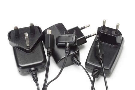 Assorted mobile phone chargers and adapters on white background