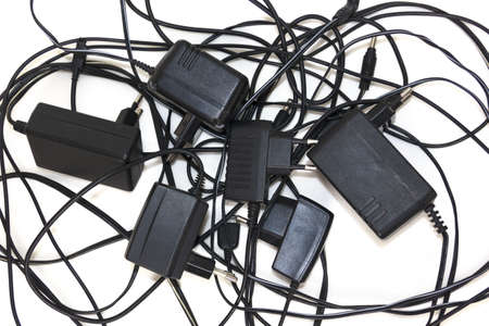 Chargers for various gadgets on a white background. Copy space.