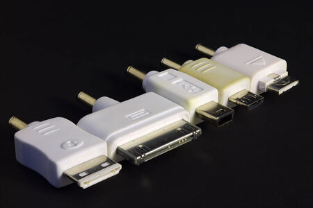 Various types of plugs and cables for audio, video, computer, smartphone and recharging connections. Evolution and change of the types of analog and USB connectors.