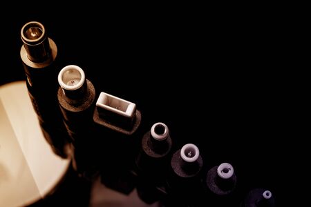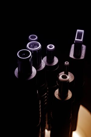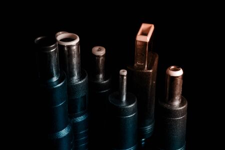 Several electro connectors on a black background shot in macro mode. Visible metal connectors of connectors.