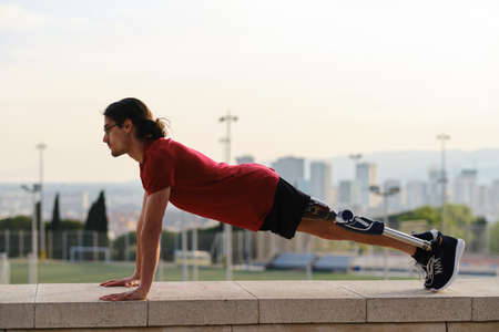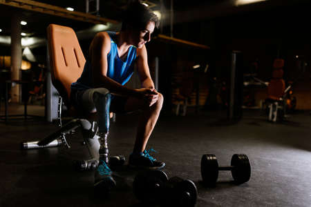 Young sportswoman with prosthesis doing exercise while working out indoors