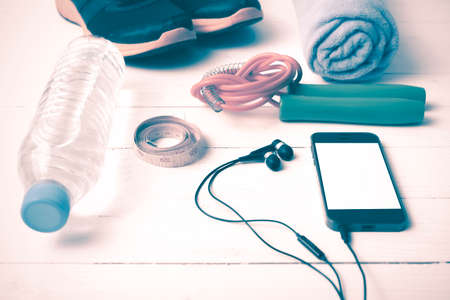 fitness equipment : running shoes,jumping rope and phone on white wood table vintage style