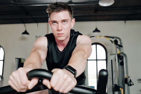 Serious handsome young sportsman riding stationary bicycle when having cardio training in gym