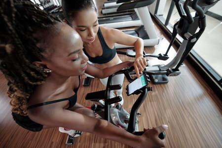 Coach installing application that helps to measure speed and distance on smartphone of client sitting on exercise bike