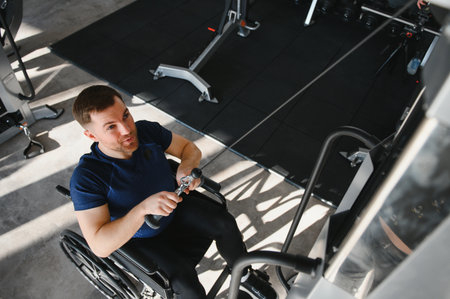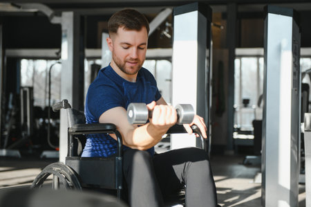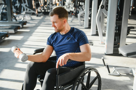 Man with disability exercising with dumbbells in modern gym, undergoing rehabilitation and showing resilience through adapted workout