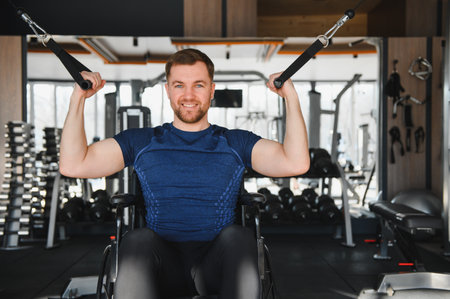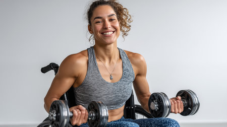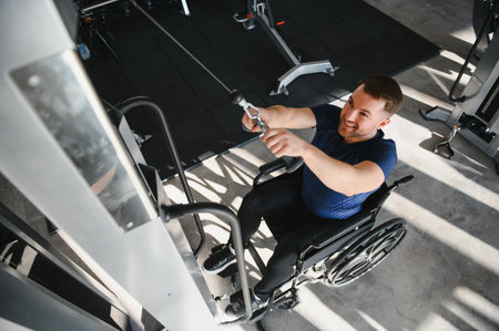 Smiling man in a wheelchair lifting weights during a rehabilitation workout in a modern gym, showing determination and strength