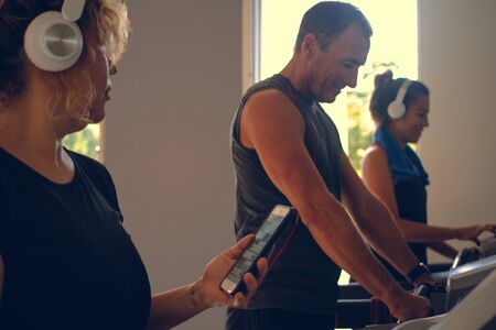 Three people using treadmills in a gym while wearing helmets to listen to music on their cell phones