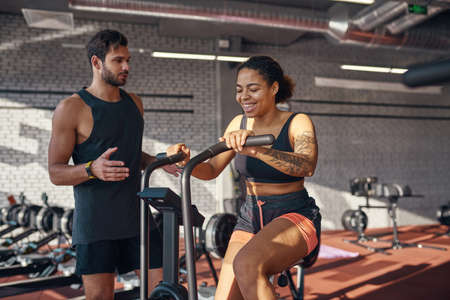 Trainer tell to girl exercise on orbitrek in gym
